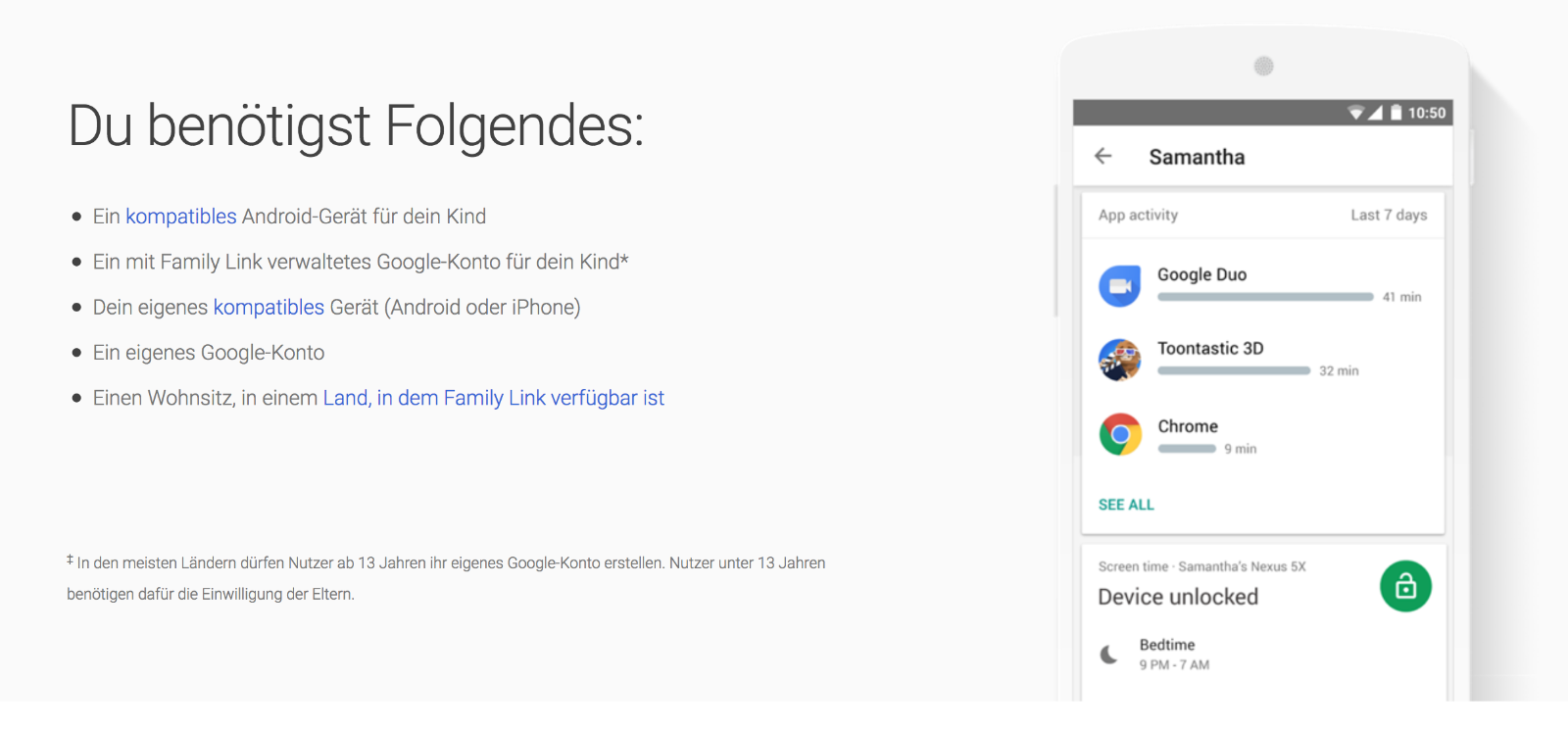 Soweit, so Google. Google Family Link soll also die Familienumgebung sein, in dem du die Android-Geräte deiner Kinder kontrollieren und steuern kannst. Das ist an der Stelle wichtig zu sagen: Auch wenn Eltern die Anwendung über iOS nutzen können, geht es bei den Endgeräten der Kinder ausschließlich um Android-Geräte. Das jedoch nicht auf allen, sondern nur für Geräte mit Android Nougat (7.0) und höher.